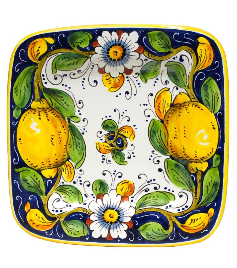 Hand-painted ceramic plate, made and produced in the heart of Tuscany, a few steps from Florence, where the manufacture of ceramics boasts a long tradition. The piece features rustic colors typical of the Florentine countryside; an interweaving of flowers and lemons on a white and blue background. The paints applied for the painting are free of lead, cadmium, nickel or heavy materials, therefore the ceramic can be used for food, as well as decorative, to set up your table and furnish your home with a classic touch made in Italy.