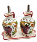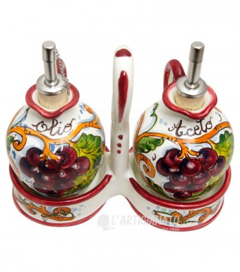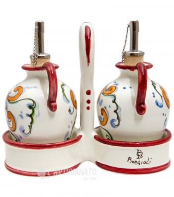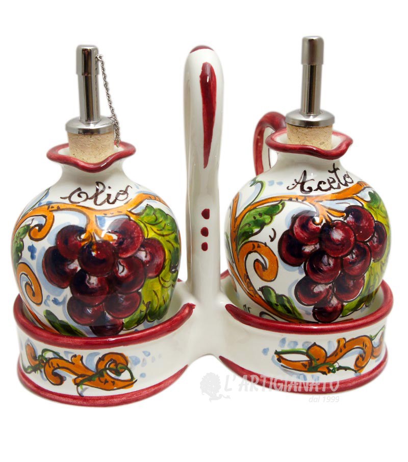 Hand-painted oil and vinegar with basket, made and produced in the heart of Tuscany, a few steps from Florence, where the manufacture of ceramics boasts a long tradition. The piece features rustic colors typical of the Florentine countryside; an interweaving of vine shoots with bunches of grapes, on a white background. The paints applied for the painting are free of lead, cadmium, nickel or heavy materials, therefore the ceramic can be used for food, as well as decorative, to set up your table and furnish your home with a classic touch made in Italy.
