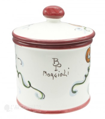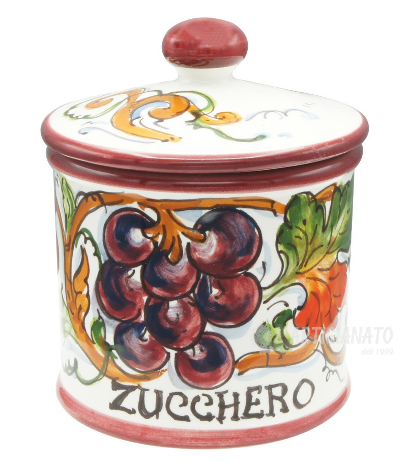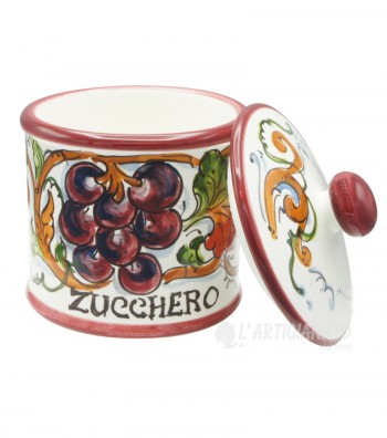 Hand-painted ceramic sugar jar made and produced in the heart of Tuscany, a few steps from Florence, where the manufacture of ceramics boasts a long tradition. The piece features rustic colors typical of the Florentine countryside; an interweaving of vine shoots with bunches of grapes, on a white background. The paints applied for the painting are free of lead, cadmium, nickel or heavy materials, therefore the ceramic can be used for food, as well as decorative, to set up your table and furnish your home with a classic touch made in Italy.