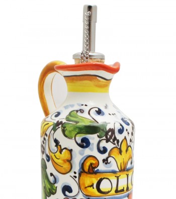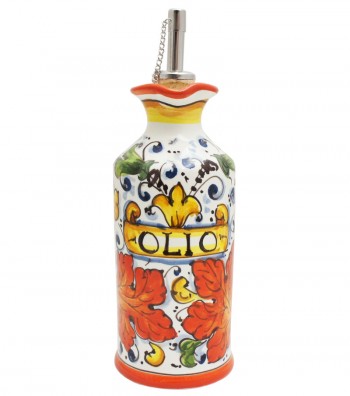 Hand-painted ceramic cruet, made and produced in the heart of Tuscany, a few steps from Florence, where the manufacture of ceramics boasts a long tradition. The piece features rustic colors typical of the Florentine countryside; a composition of flowers and leaves inspired by the greenery that surrounded the Villa Medici of Cafaggiolo, located north of Florence.The paints applied for the painting are free of lead, cadmium, nickel or heavy materials, therefore the ceramic can be used for food, as well as decorative, to set up your table and furnish your home with a classic touch made in Italy.