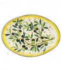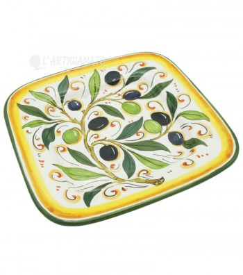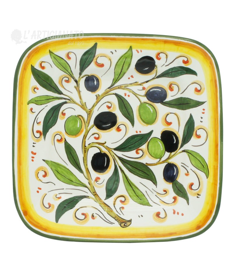 Hand-painted ceramic plate, made and produced in the heart of Tuscany, a few steps from Florence, where the manufacture of ceramics boasts a long tradition. The piece features rustic colors typical of the Florentine countryside; an intertwining of twigs and olive leaves with black and green olives, on a white background.The paints applied for the painting are free of lead, cadmium, nickel or heavy materials, therefore the ceramic can be used for food, as well as decorative, to set up your table and furnish your home with a classic touch made in Italy.