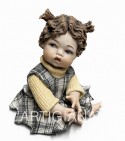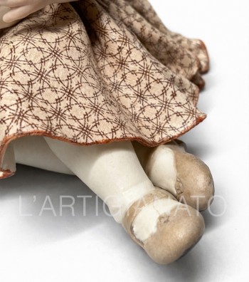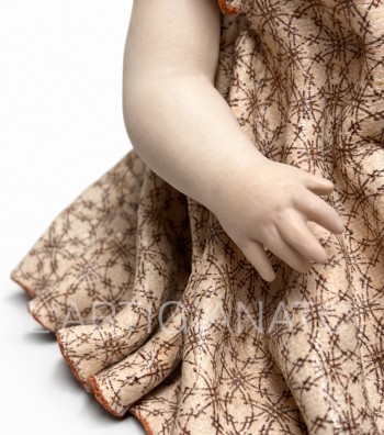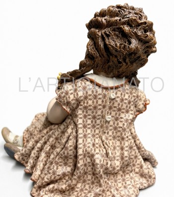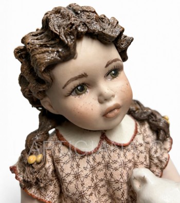 I particolari sono curati con attenzione: le lentiggini leggere sul viso, i capelli castani modellati in morbide trecce, il vestitino color crema arricchito da un delicato motivo geometrico e dal colletto chiaro che richiama l’eleganza delle bambole d’altri tempi.