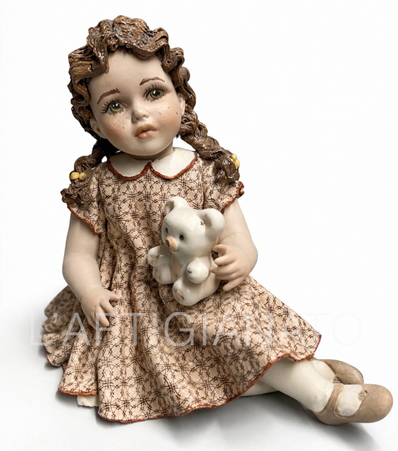 Bambola in porcellana da collezione raffigurante una dolce bambina seduta con orsetto. Realizzata con grande cura nei dettagli, presenta capelli castani intrecciati, lentiggini delicate e abito color crema con fantasia geometrica. Perfetta come idea regalo, complemento d’arredo o pezzo per collezionisti amanti dello stile vintage e delle creazioni artigianali dal fascino senza tempo.