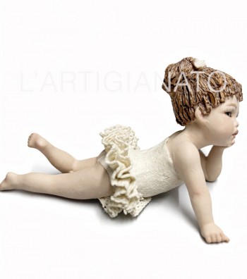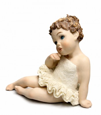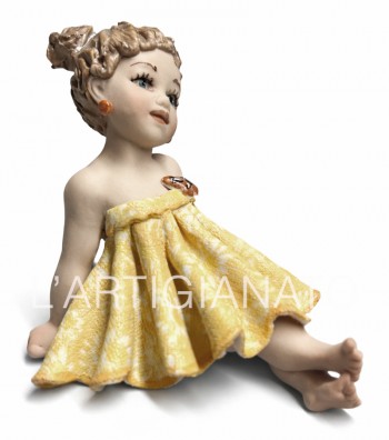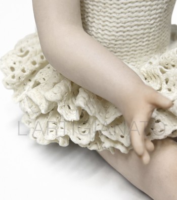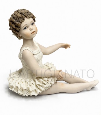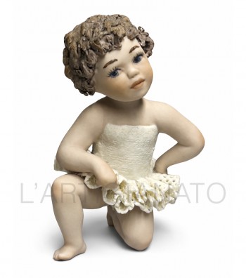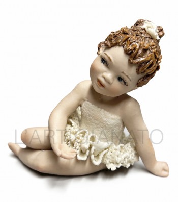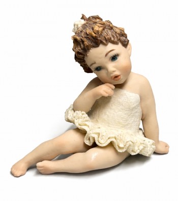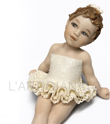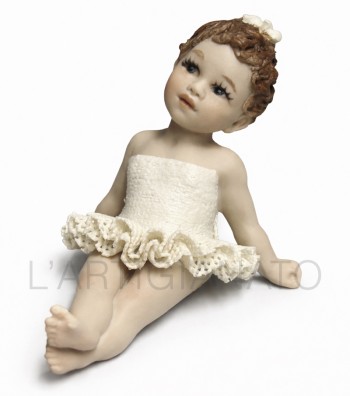 Figura in porcellana artigianale raffigurante una bimba seduta con gambe distese, con tutù color avorio. Il corpetto liscio e la balza traforata esaltano la leggerezza del modellato, mentre i...