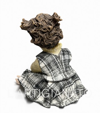 Statuina in porcellana artigianale raffigurante bambina seduta con abito scozzese grigio e dettagli dipinti a mano. Scultura decorativa elegante in stile vintage, ideale per collezionisti e...