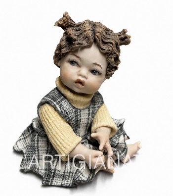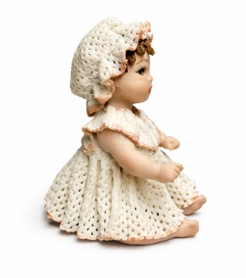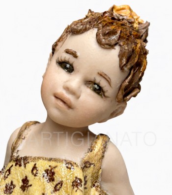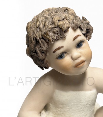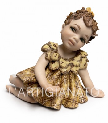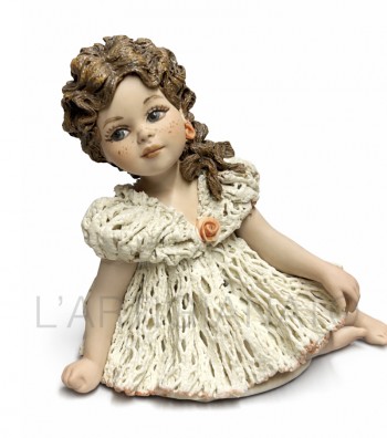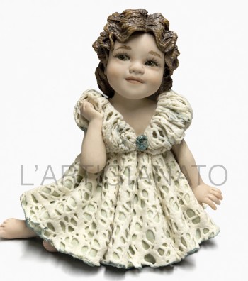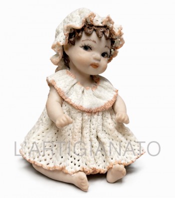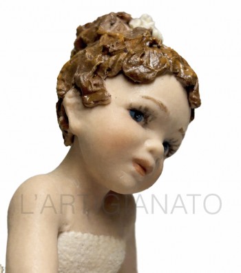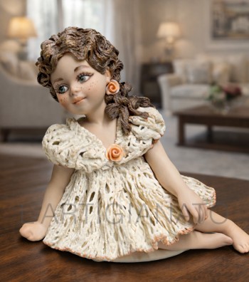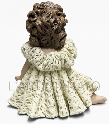 Statuina in porcellana artigianale raffigurante una bambina seduta con abito avorio traforato e dettagli a rosellina color pesca. I ricci castani raccolti lateralmente incorniciano un volto...