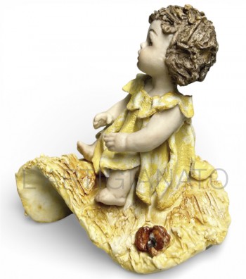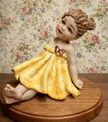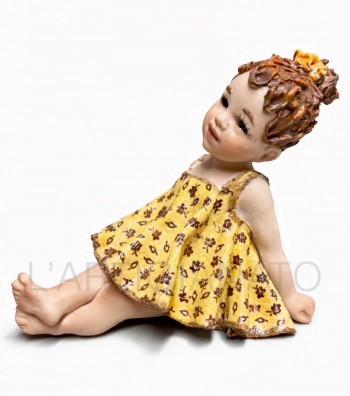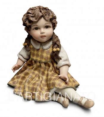 Bambola in porcellana da collezione raffigurante una tenera bimba seduta su un tronco, con abito giallo decorato da motivi floreali. Ricca di dettagli, presenta capelli castani mossi ed...