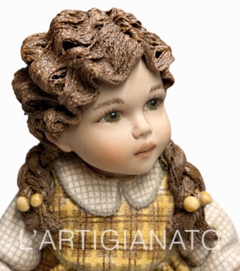 Bambola in porcellana da collezione raffigurante una dolce bambina seduta con orsetto. Realizzata con grande cura nei dettagli, presenta capelli castani intrecciati, lentiggini delicate e abito...