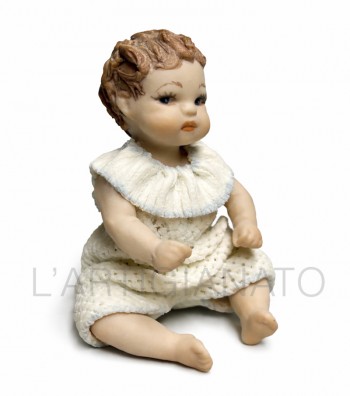 Bambola in porcellana da collezione raffigurante un tenero bimbo seduto con abitino bianco lavorato a maglia e delicato colletto rifinito d’azzurro. Realizzata con grande cura, presenta capelli...