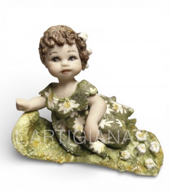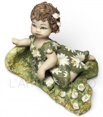 Bambola in porcellana da collezione raffigurante una dolce bimba distesa su un prato fiorito. Ricca di dettagli, presenta capelli castani impreziositi da piccoli fiori e un abito verde con...