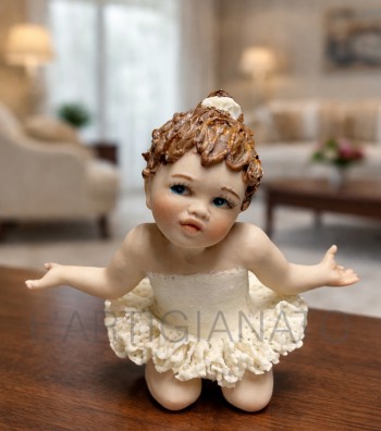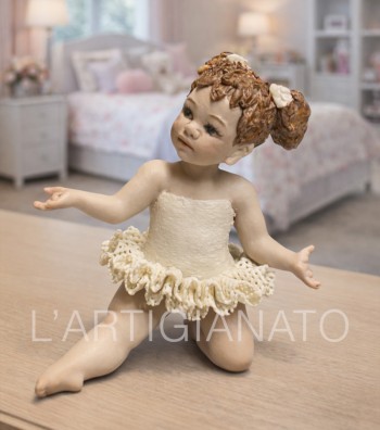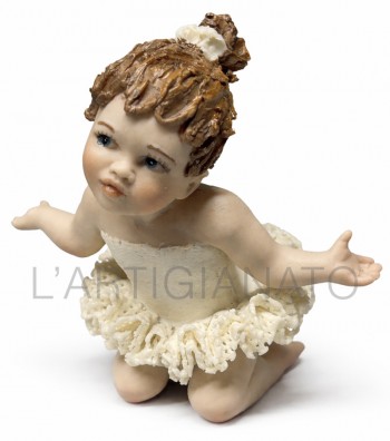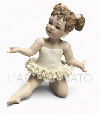Statuina in porcellana artigianale raffigurante una giovane ballerina inginocchiata con le braccia aperte in un gesto accogliente. Indossa un tutù color avorio con corpetto liscio e balza ricca...