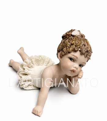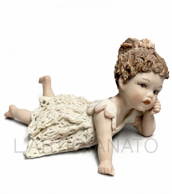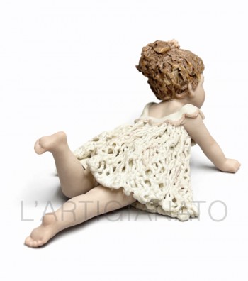 Statuina in porcellana artigianale raffigurante bambina sdraiata con abito traforato e dettagli dipinti a mano. Scultura decorativa elegante, ideale per collezionisti e per arredare ambienti...