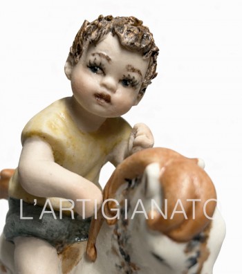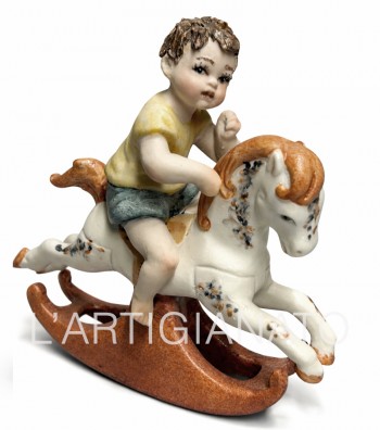 Statuina in porcellana artigianale raffigurante bambino su cavallo a dondolo con dettagli dipinti a mano. Scultura decorativa elegante e vintage, ideale per collezionisti e per arredare ambienti...