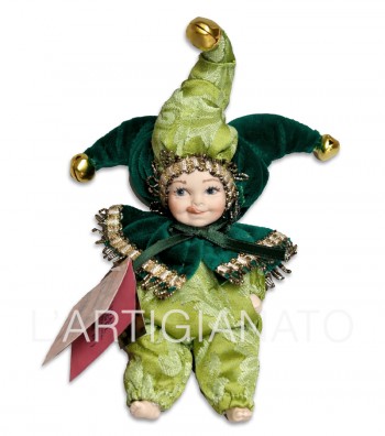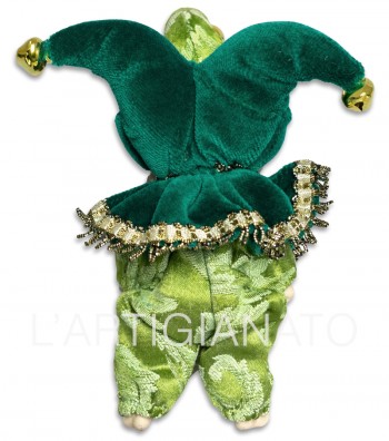 Statuina artigianale in porcellana raffigurante piccolo giullare con costume verde e dettagli decorativi raffinati. Scultura in stile vintage con elementi tessili e finiture curate, ideale per...