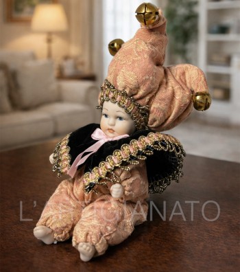 Statuina artigianale in porcellana raffigurante piccolo giullare con costume rosa decorato e dettagli raffinati. Scultura in stile vintage con elementi tessili ricchi e finiture curate, ideale...