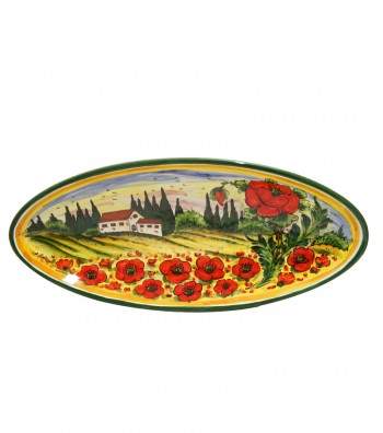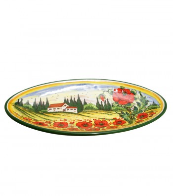 Piatto lavorato in ceramica dipinta a mano, realizzato e prodotto nel cuore della Toscana, a pochi passi da Firenze, dove la produzione ceramica vanta una lunga tradizione. Il pezzo presenta colori rurali tipici della campagna fiorentina; un paesaggio rustico con case circondate da alberi, su uno sfondo verde ricoperto di fiori di papavero rossi. Le vernici applicate per la pittura sono prive di piombo, cadmio, nichel o materiali pesanti, pertanto le ceramiche possono essere utilizzate per uso alimentare, oltre che decorativo, per allestire la vostra tavola e arredare la vostra casa con un tocco classico firmato made in Italy.