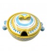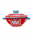 Formaggiera in ceramica dipinta a mano, realizzata e prodotta lungo la Costiera Amalfitana; Vietri sul Mare, un piccolo gioiello di case colorate, vicoli e botteghe, dove la produzione ceramica vanta una lunga tradizione. Il pezzo presenta colori vivaci caratteristici del borgo marino; un drappeggio a pois celeste, con gatti stilizzati, su uno sfondo bianco e giallo ocra. Le vernici applicate per la pittura sono prive di piombo, cadmio, nichel o materiali pesanti, pertanto le ceramiche possono essere utilizzate per uso alimentare, oltre che decorativo, per allestire la vostra tavola e arredare la vostra casa con un tocco classico firmato made in Italy.